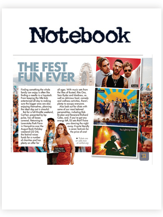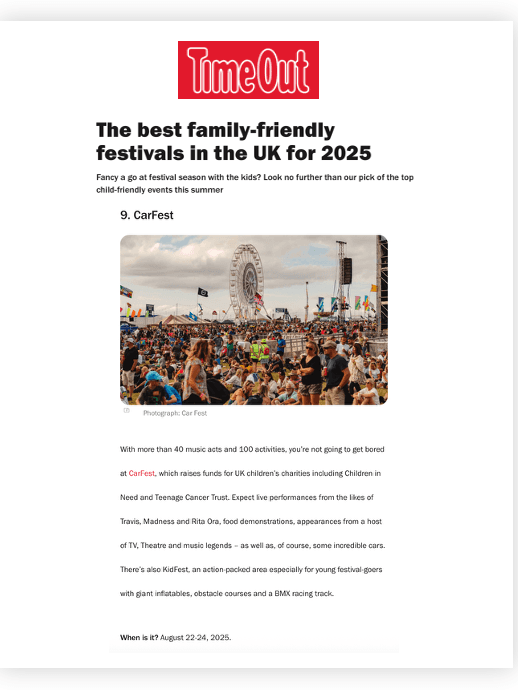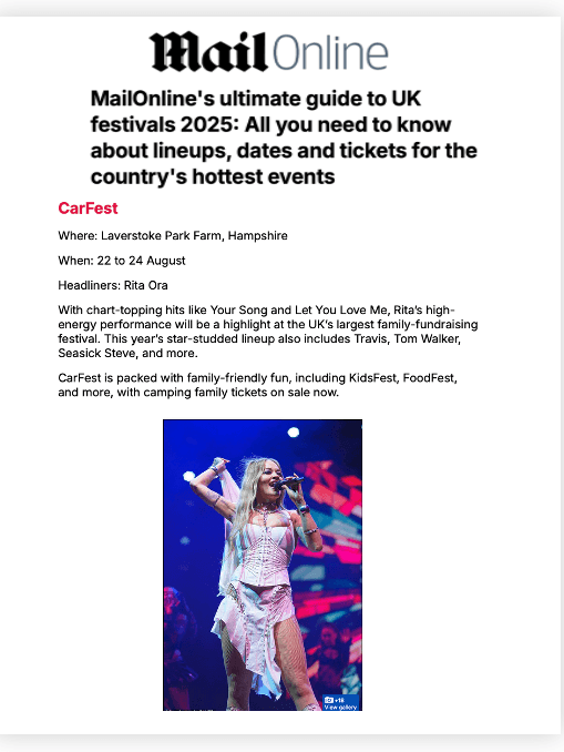 Throughout the 2025 campaign, we significantly raised awareness of CarFest by securing extensive coverage across national and international media. From festival guides and event listings to talent interviews and feature pieces, our PR activity delivered strong visibility, reinforced CarFest’s reputation as the UK’s leading family fundraising festival, and drove ticket sales across all regions.